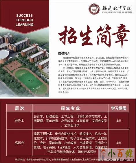 福建教育学院是一所由省政府设立、省教育厅主管、国家教育部批准承担全省中小学骨干教师、校长培训和在职教师及社会人员学历提高教育并具有普通高校招生资格的本科高等院校。学院创办建于1956年,是我省第一批自考主考院校。建院以来,已向社会输送本专科生10多万人,现有自考、函授本专科学历在校生三万多人。...